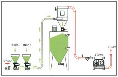 負壓系統主要利用真空型羅茨風機(或真空泵)在密封管道內產生的真空,以低于外界大氣壓的空氣流,通過吸嘴(或星型給料閥與混合加速室單元)進料,再與空氣混合,沿輸料管道吸送到旋風分離器(俗稱沙克龍)進行氣固分離,實現從低處或散裝處多點向高處一點或多點進行物料輸送。其特點是物料不外泄,不產生環境問題,供料裝置相對簡單。